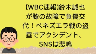 話題のニュース・人 【WBC速報】鈴木誠也が膝の故障で負傷交代!ベネズエラ戦の盗塁でアクシデント、SNSは悲鳴 3月15日のWBC(ワールドベースボールクラシック)対ベネズエラ戦での試合中に鈴木誠也選手が膝を故障。その詳細を速報でお届けします。 2026.03.15 話題のニュース・人